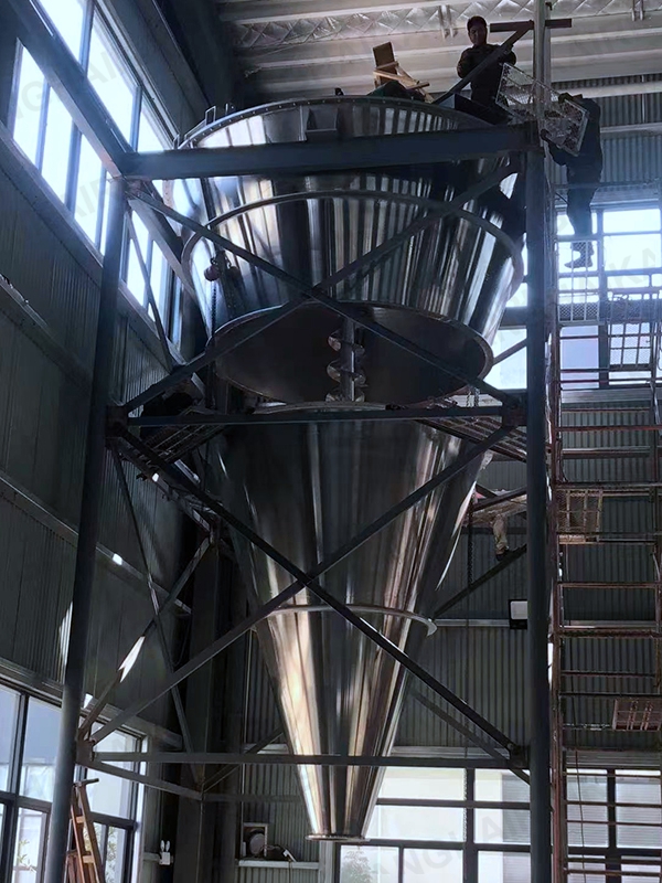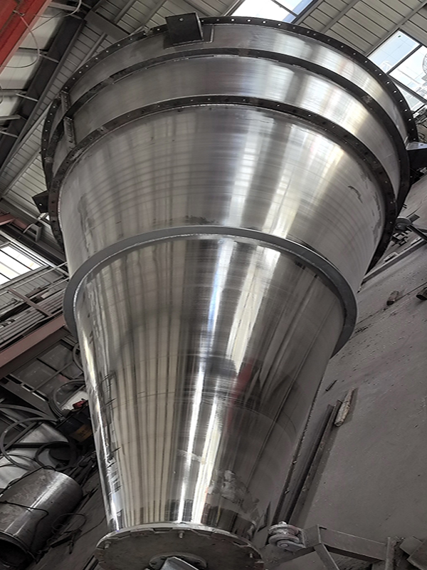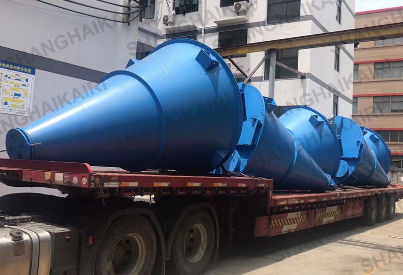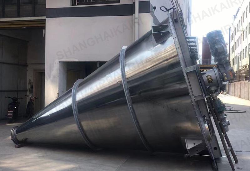 锥形三螺旋混合机(8m³以上):在原双螺旋锥形混合机基础上系统进行创新改进,增加一条螺旋,采用两条对称排列螺旋及中间一条长螺旋(叶片加大)运转,原长螺旋斜度大、压力大、今缩短螺旋长度牢固,增加螺旋的强度,使得三条螺旋比现有的双螺旋运行更加的稳定,螺旋越多,混合效果越明显,解决了中间物料搅拌的盲区及死角,底部物料不断往上提升,混合精度更高,提高生产率,保证质量,使设备寿命增长。采用该系列机提升混合效果,解决了用户对特轻、特细等物料难以混合均匀的困难,对密度大等物料更加适用,同时对一般物料速度、精度均有明显提高,减少混合时间,具有节能意义。