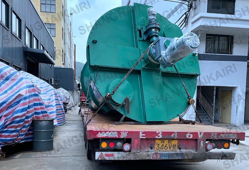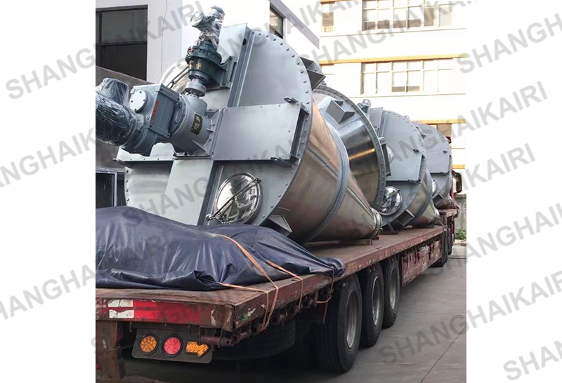 混合机三条螺旋(二条对称排列螺旋及中间一条长螺旋)的快速自转,将物料向上提升,形成三股沿筒壁自下向上的螺柱形物料流,长螺旋运转解决了中间物料混合的盲区及底部死角,